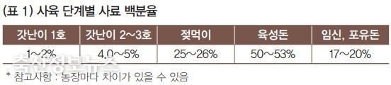 사료는 매우 중요하므로 전문가의 도움을 받아 농장의 사육 환경이나 사양 기술, 돼지의 건강 상태를 종합하여 결정하는 것이 가장 바람직한 방법이다. (표 1)은 일반적인 사료 프로그램을 제시한 것이다. 요즘같이 사료비가 고가 일 경우는 갓난이 사료는 자돈 성장에 꼭 필요한 양만 급여하고 다음 단계 사료를 급여하는 것도 적극 검토 해야 할 것이다.
