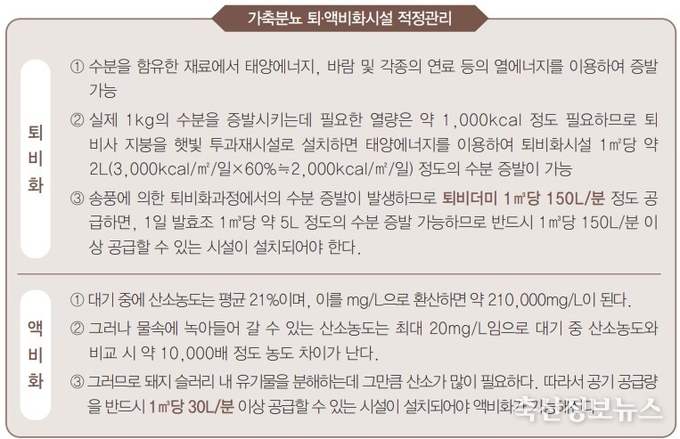 양축농가 스스로 솔직하게 자기 농장에 설치된 퇴비화시설 또는 액비화시설에서의 겨울철에 1일 가축분뇨 적정처리 용량이 얼마인지 계산해야 한다. 양돈농가를 예로 들면, 매일 발생하는 돼지분뇨를 매일 처리하지 못한다면 양돈장 경영에 직접적인 어려움을 겪게 되고, 또한 악취․파리 및 민원 발생 등이 양돈장의 운영에 큰 압박요인으로 작용하고 있는 것은 모두 알고 있는 내용이다.