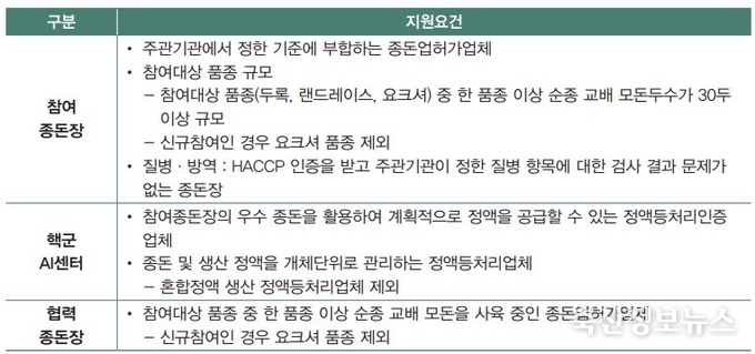 사업대상자 선정 시 축산법 제21조에 따른 우수정액등처리업체를 대상자로 우선 선정 : 관할지역 내 우수정액등처리업체가 없거나, 신청 저조시 돼지정액 품질 관리 및 위생·시설 수준이 높은 업체 선정