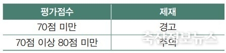 • “주의 → 경고 → 사업참여 취소” 순으로 하며, “주의” 조치가 2년 연속이면 “경고” 조치하고 “경고” 조치 후 다음 해에 “주의” 이상 평가를 받은 업체는 사업참여 취소