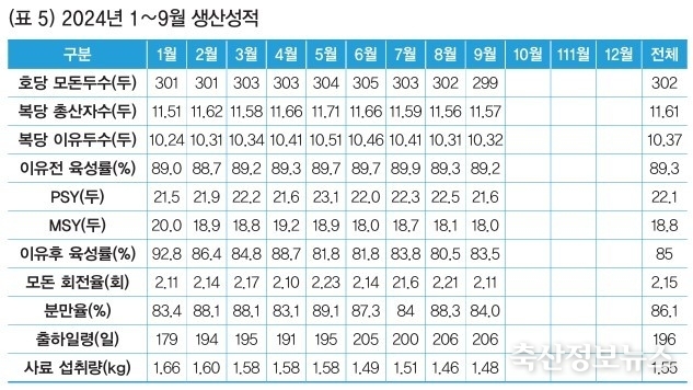 한돈팜스 2023년부터 2024년 9월까지 전산성적을 살펴보면 여러 가지 성적 중 이유 전 육성률과 이유 후 육성률을 집중적으로 분석해 볼 필요가 있다. 이유 전 폐사가 10% 전후, 이유 후 폐사가 15% 전후로 나타나고 있다. 이 숫자가 의미하는 것은 한돈산업에 많은 의미를 부여한다고 생각한다. 다시 말하면 육성률을 개선하지 않고는 국제 경쟁력을 유지하기 어렵다는 것이다.