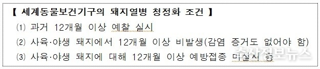 제주도는 2028년 하반기 WOAH에 인증 신청서를 제출하고 과학위원회 심사를 거쳐 2029년 5월 총회에서 청정화 인증을 받는 것을 목표로 하고 있다.