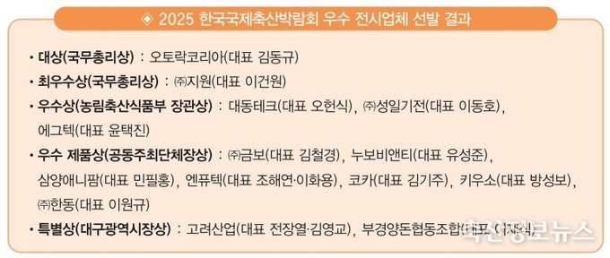 2025 한국국제축산박람회(조직위원장 이승호 (사)한국낙농육우협회장, KISTOCK 2025)가 지난 9월 10~12일까지 대구 EXCO 서관 1층 전관과 야외전시장에서 ‘축산의 고유 가치와 디지털 이행’을 주제로 3일간의 일정을 마무리하고 성황리에 막을 내렸다.