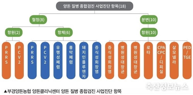 부경양돈농협 양돈클리닉센터에서는 양돈 질병 종합검진 사업을 통해 매년 조합원 농가를 대상으로 다음과 같은 검사 항목에 대해 주기적으로 검사를 진행하고 있다.