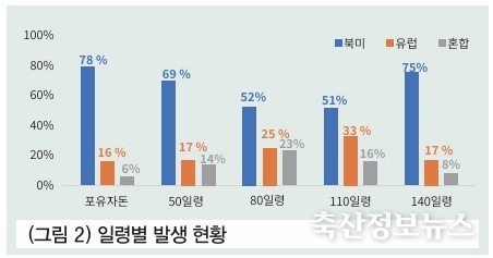 일령이 증가할수록 북미형 출현율이 다소 감소하기는 하나 전 구간 북미형→유럽형→혼합형의 순서로 출현율이 나타난다.