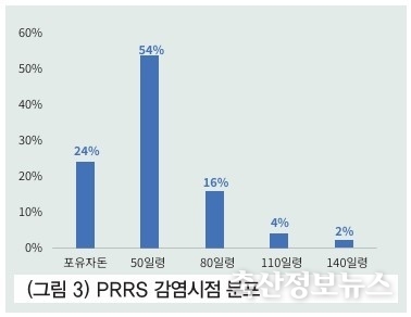 일령별 감염시점 분석 시 50일령 전후가 54%로 가장 높고 다음으로 포유자돈 24%, 80일령 16% 순으로 50일령 전후로 감염이 가장 많이 발생한다는 것을 알 수 있다.