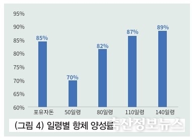 일령별 항체 양성률은 110일령과 140일령의 경우 각각 90%에 육박하는 양성률을 보이며 80일령 82%, 50일령 70%를 보인다. 포유자돈 구간 항체 양성률 85%는 대부분 모체 이행항체로 볼 수 있으며, 자돈 감염이 시작되는 50일령부터 일령이 증가할수록 항체가 높아지는 형태가 확인된다.