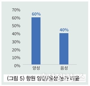 농장 기준 PCV2 항원 양성농가 비율은 60%로 음성농가 40% 대비 높은 수준이다. 대부분 농장에서 써코 백신을 하고 있음을 감안할 시 항원 양성농가 비율 자체는 무시할 수 없는 수치이다.