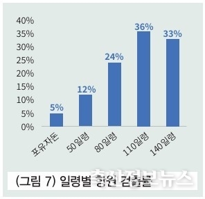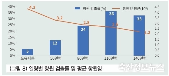 일령별 항원 검출률 분석 시 110일령 36%, 140일령 33%, 80일령 24%, 50일령 12%, 포유자돈 5% 순으로 110일령과 140일령 구간에서 항원 검출이 가장 빈번하다는 것을 알 수 있다.