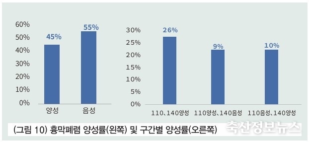 농가 기준 항체 양성률 분석 시 양성농장은 45%, 음성농장은 55%로 나타난다. 110, 140일령 구간별 양성률을 보면 110, 140일령 모두 양성이 26%, 140일령 양성이 10%로 분석된다. 110일령 항체만 검출된 것은 9%로 확인된다.