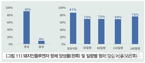 농장 기준 돼지인플루엔자 항체 양성 비율은 92%, 음성은 8%로 대다수 농장은 SIV 항체를 가지고 있다. 일령별 양성 비율은 포유자돈 87%, 50일령 70%, 80일령 70%, 110일령 69%, 140일령 76%로 포자구간 항체 양성률이 가장 높고, 나머지 구간은 140일령에서 약간 높으나 대체로 70% 정도의 항체 양성률을 보인다.