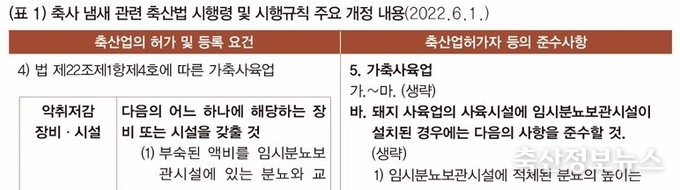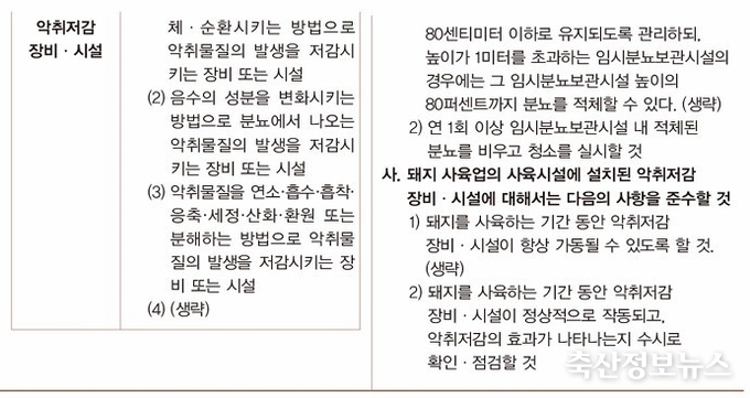 주요 내용은 ‘축산업의 허가 및 등록 요건(축산법 시행령 14조제2항 및 14조의2제2항, 별표 1)’에 냄새저감시설을 정의하고 설치하도록 했다. 또한 ‘축산업허가자 등의 준수사항(축산법 시행규칙 제30조, 별표 3의3)’에는 임시분뇨보관시설 적체분뇨 높이를 제한하고 청소하도록 했으며, 냄새저감시설도 상시 가동 및 확인·점검하도록 했다.