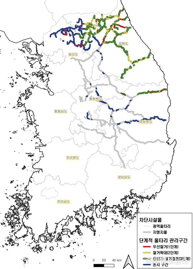 마지막으로 존치구간(621.2km)은 양돈농가 밀집지역(10km 이내)과 충남·전남·경남 등 아프리카돼지열병 비발생지역으로의 서진(西進), 남하(南下) 차단을 위해 최후 방어선 유지가 필요한 지역이 해당한다.