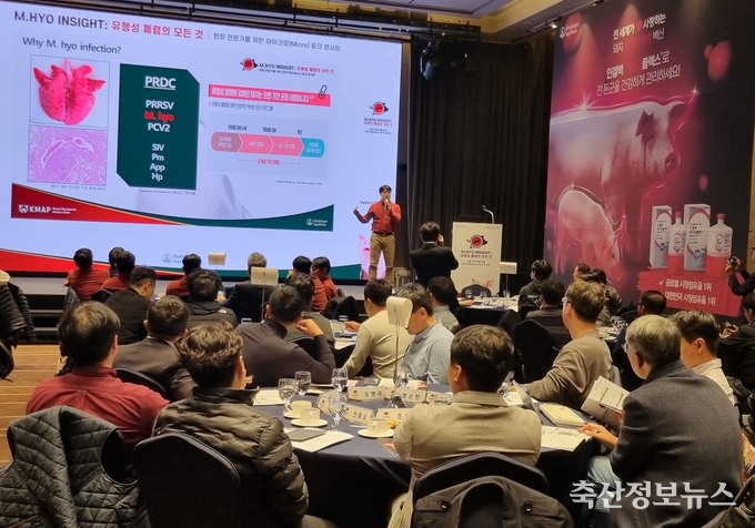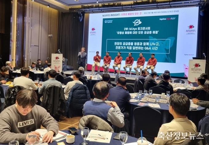 한국베링거인겔하임동물약품㈜(대표이사 서승원)은 지난 11월 5일 대전 롯데호텔에서 ‘M.HYO INSIGHT (엠하이오 인사이트)’ 세미나를 개최했다. 이번 행사는 ‘현장 전문가를 위한 마이크로(Micro) 토크 콘서트’라는 슬로건 아래 돼지 유행성 폐렴(Mycoplasma hyopneumoniae, M.hyo)의 최신 동향과 질병 컨트롤 전략을 공유하는 자리로 마련되었다.