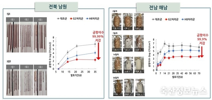 남원에서는 건조·발효 5주 후 곰팡이 수가 99.99% 감소(6.3→2.3 log CFU/㎠)했고, 해남에서는 숙성 10주 후 99.9%가 감소(6.0→3.6 log CFU/㎠)하는 등 제품 폐기 위험을 낮출 수 있는 항균 효과가 확인됐다. 또한 색, 향, 수분 등 품질 변화는 거의 없고, 산패도는 최대 75% 낮게 유지돼 맛과 향을 오래 유지할 수 있는 것으로 나타났다. 이 기술은 지난해 특허 출원*을 완료했으며, 이번 현장 실증을 통해 산업 적용 가능성을 확인했다.