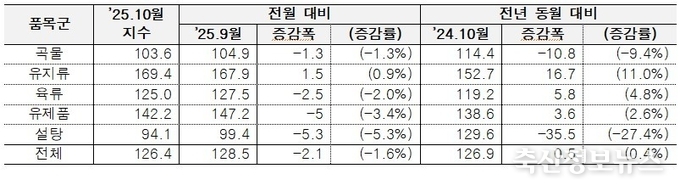 유엔 식량농업기구(FAO)*에 따르면 2025년 10월 세계식량가격지수는 126.4포인트**를 기록, 전월(128.5포인트) 대비 1.6% 하락했으며 두 달 연속 내림세가 이어졌다고 밝혔다. 품목군별로 곡물, 육류, 유제품, 설탕 가격은 하락, 유지류 가격은 상승하였다.
