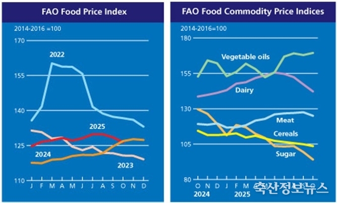 육류 가격지수는 전달보다 2% 떨어졌지만 전년 동기 대비 4.8% 높았다. 돼지고기와 가금육 가격 급락이 전체 하락을 이끌었다. 유럽연합의 공급 과잉과 중국의 신규 관세, 조류인플루엔자(HPAI)로 인한 브라질 수출 제한 등이 영향을 미쳤다. 반면 쇠고기 가격은 호주산 중심으로 유통 가격이 올랐다.