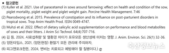 양돈농가의 모돈 관리는 생산성 향상과 경제성 향상을 위해 중요하다. 특히 분만 시기는 생식 주기 중 가장 많은 스트레스를 받는 시기이며, 이러한 스트레스를 최소화하여 이유자돈 생산성을 증가시키는 것이 중요하다. 또한 해당 시기에는 모돈의 장 기능이 저하되는 문제가 발생하는데, 땀샘이 발달하지 않은 모돈은 체온이 증가하며 사료 섭취량이 감소하여 재귀발정일이 지연되는 문제가 발생한다. 모돈의 사료 섭취량이 감소하게 되면 포유량이 감소하기에 자돈의 이유체중이 감소하며, 이로 인해서 농가 생산성이 감소하게 되는 것이다. 본고에서는 장기적으로 농가 생산성 감소에 영향을 미치는 모돈의 장 기능 저하를 예방하는 방법을 알아보고자 한다.