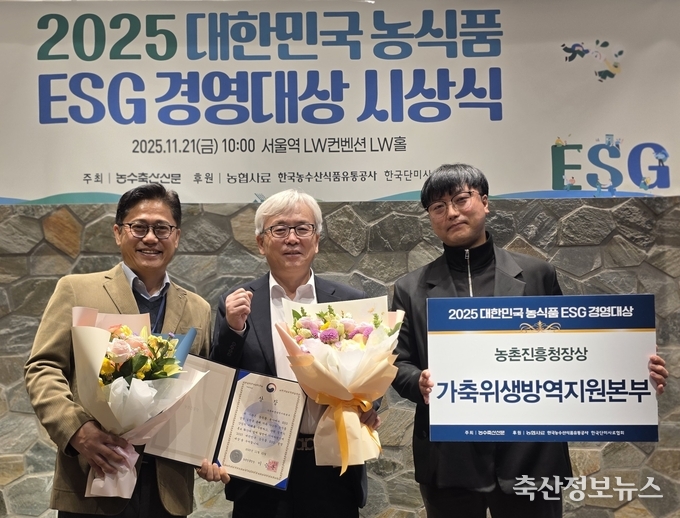 가축위생방역지원본부(본부장 김태환)가 농림축산식품부와 농촌진흥청이 후원하고 농수축산신문이 주최·주관하는 '2025 대한민국 농식품 ESG 경영대상'에서 최우수상인 농촌진흥청장상을 수상했다고 밝혔다.