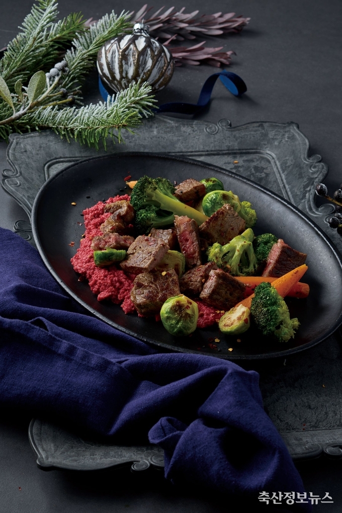 한우 등심은 올리브유, 소금, 후추로 밑간을 하고, 당근 및 브로콜리, 양배추, 비트는 한입 크기로 썬 뒤 살짝 데친다. 삶은 병아리콩과 데친 비트에 마늘, 레몬즙, 올리브유, 소금을 넣어 갈아 비트 후무스를 만든다. 데친 채소는 팬에 구워 풍미를 더하고, 밑간한 한우 등심도 취향에 맞게 구워 한입 크기로 자른다. 접시에 비트 후무스를 펼친 뒤 구운 한우 등심과 채소를 올리고 크러쉬드 페퍼·검은깨로 마무리한다. 비트의 은은한 단맛과 후무스의 고소함이 한우의 깊은 풍미와 어우러져 색감·영양·맛을 동시에 만족시키는 보양 메뉴가 된다.