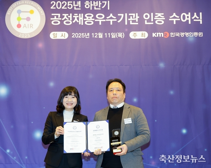 축산환경관리원(원장 문홍길)은 지난 12월 11일 서울 여의도 FKI타워 컨퍼런스센터에서 열린 ‘2025년 하반기 공정채용인증 수여식’에서 2년 연속 한국경영인증원(KMR)의 ‘공정채용 우수기관’ 인증을 획득했다고 밝혔다.
