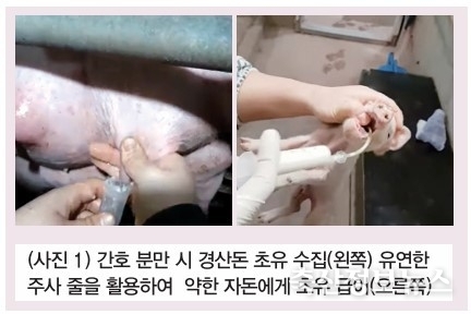 ▶생후 6시간 이내에 모든 새끼가 초유를 먹도록 할 것, ▶약한 자돈은 직접 젖꼭지에 붙일 것,▶초유를 못 먹은 자돈은 식도 내부에 직접 초유를 주입할 것