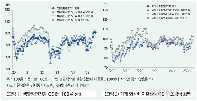 가계 생활형편전망 CSI는 7월 101로 6월에 이어 100을 상회했다. 가계 외식비 지출전망도 회복세를 보이며, 소득 500만원 이상 가계의 경우 2달 연속 100을 상회했다. 민생 회복소비 쿠폰 지급 등의 영향으로 보인다.
