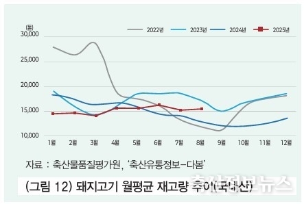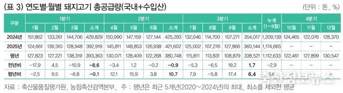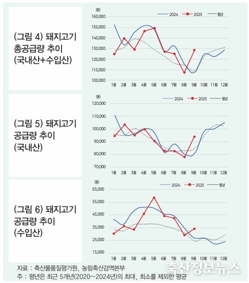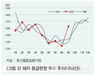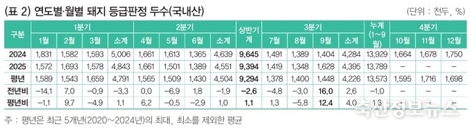 전년부터 심화한 무더위와 고병원성 돼지생식기호흡기증후군(Porcine Reproductive and Respiratory Syndrome, PRRS), 돼지유행성설사병(Porcine Epidemic Diarrhea, PED)의 확산은 2025년 상반기에도 영향을 주어 2025년 상반기(1~6월) 등급판정 두수는 전년 대비 2.6% 감소한 9,394천두였으나, 하반기 특히 9월부터는 전년 동기 대비 증가 양상을 보였다. 올해 9월 등급판정 두수는 추석(10월 초) 성수기와 맞물려 전년 대비 16.0%(작년 추석은 9월 중순) 및 평년 대비 12.4% 증가했으며, 9월 누계 물량은 13,789천두로 전년 대비 1.0% 감소한 반면 평년 대비 1.6% 증가했다.