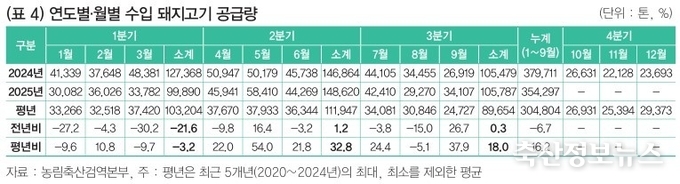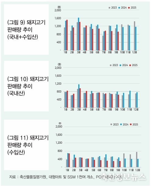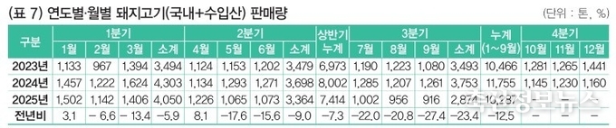 대형마트 및 SSM 1천여 개소의 POS 데이터를 기준으로 하는 돼지고기(국내산+수입산) 판매량은 10,287톤으로 2025년 9월 누계 기준 전년(11,755톤) 대비 12.5% 감소했다. 1분기는 전년 동기 대비 5.9%, 2분기 9.0%, 3분기 23.4% 각각 감소하며 점차 감소 폭이 커졌다. 9월 누계 기준으로는 전년 대비 12.5% 감소한 10,287톤으로 나타났다.