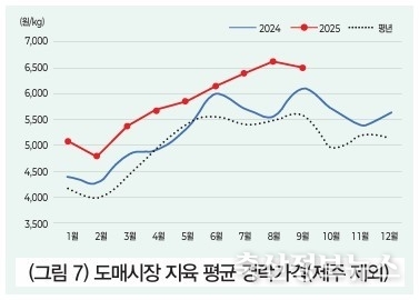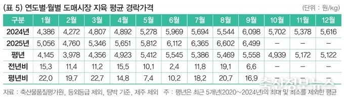 평년의 도매시장 지육 평균 경락가격은 보통 5~6월과 추석을 앞둔 9월경에 가장 높은 경향을 보였으나, 2025년에는 폭염과 소모성 질병 등으로 인한 출하마릿수 감소로 8월이 가장 높은 가격을 보였다. 2025년 9월 현재 전년과 평년 대비 계속해서 높은 경락가격을 보였으며, 특히 6월과 9월을 제외하고 모두 전년 대비 두 자릿수 이상 높은 수준을 형성했다.