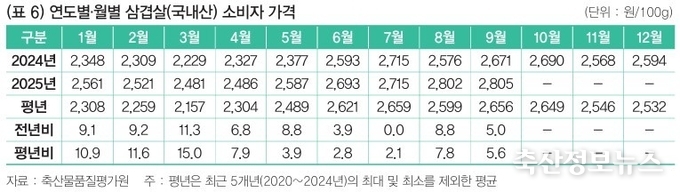 국내산 삼겹살 소비자 가격도 전년과 평년 대비 모두 높은 수준을 보였으나 지육 경락가격보다는 상대적으로 증가율이 낮은 수준이었다. 이는 수입 육가공 원료육의 대체재인 국내산 돼지고기 뒷다리살(후지) 재고량이 과거 대비 낮은 수준을 유지하며, 높은 수요가 지속되어 과거 대비 높은 가격이 형성되어 지육 가격에도 영향을 준 것으로 판단된다.