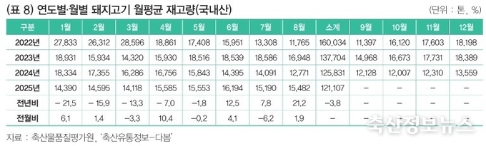 2025년 8월 누계 재고량은 전년 동기 대비 3.8% 감소한 121,107톤이었다. 1월, 2월, 3월, 4월, 5월의 재고량은 전년 대비 21.5%, 15.9%, 13.3%, 7.0%, 1.8% 각각 줄어들었으나 6월에는 12.5%, 7월에는 7.8%, 8월에는 21.2% 각각 증가했다.