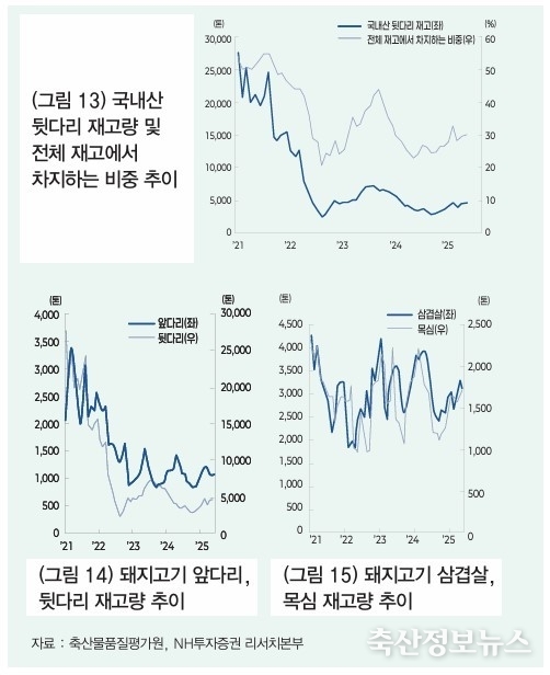 부위별로 살펴보면, 국내산 뒷다리 재고량은 2024년부터 전체 재고에서 차지하는 비중이 줄어드는 추세를 보였다. 2024년 연말 이후 5월까지 삼겹살과 목심 재고량은 증가했으나 과거 대비 높은 수준은 아니었다.