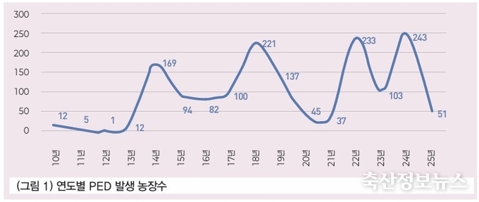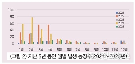(그림 1)은 연도별 PED 발생 농장수를 나타낸 것이고, (그림 2)는 지난 5년 동안 월별 발생 농장수를 나타낸 것이다. (그림 1)과 (그림 2)에서 보는 바와 같이 PED는 최근에 2~3년을 주기로 다발하며 1월부터 4월까지 잦은 것으로 확인된다.