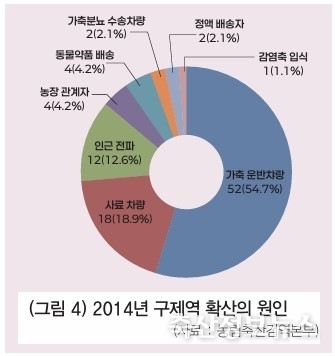 (그림 4)은 2014년 구제역 발생 시 확산 원인을 나타낸 것으로 돼지 운반차량의 비율이 가장 높다. (그림 4)와 같이 돼지 운반차량은 질병 전파의 주요한 매개체로 알려져 있다.