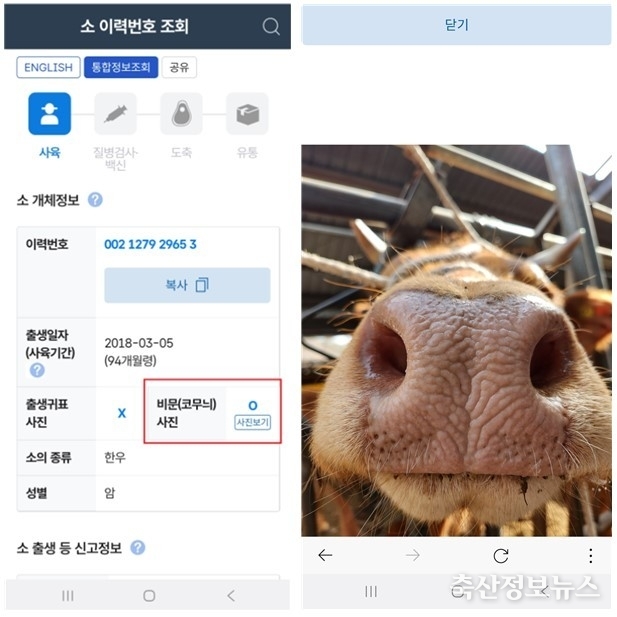 소의 코 무늬인 ‘비문’은 소의 개체식별 정확도를 획기적으로 높이는 정보로, 이번 서비스를 통해 비문 정보가 등록된 일부 개체는 우선 조회가 가능하다. ‘축산물 이력정보 앱’을 실행해 개체식별 번호를 조회하면 소 비문 사진을 ‘원터치’로 즉시 확인할 수 있다. 소 개체식별 번호 조회 시 이력 정보와 함께 해당 소의 비문 사진을 한 번에 볼 수 있게 된 셈이다.
