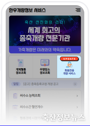 한국종축개량협회(회장 이재윤)는 한우개량정보 앱의 ‘회원 전용 개량 서비스 고도화’를 올해 3월 완료를 목표로 추진하고 있으며, 이에 앞서 우선 개발된 메뉴를 1월 5일부터 제공할 예정이라고 밝혔다.
