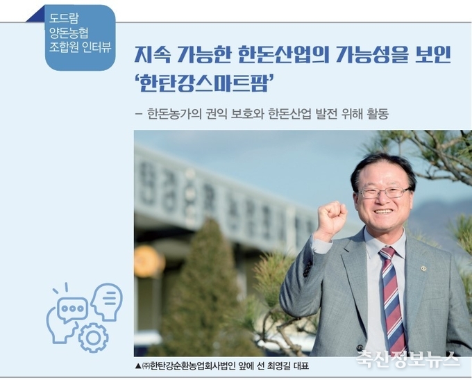 여러 어려움 속에서도 냄새 민원 및 가축분뇨 처리 문제는 물론, 스마트축산 기술을 접목한 지속 가능한 한돈산업의 모델을 제시한 최영길 대표(대한한돈협회 수석 부회장)를 만나 그 과정에 관한 이야기를 들어 보았다. 최영길 대표는 한수 이북지역인 경기도 포천에서 2012년 ㈜한탄강순환농업회사법인을 설립하여 자원순환 농업의 틀을 마련하고, 이어 2018년에는 스마트축산 기술을 접목한 모돈 650여두 규모의 번식농장인 한탄강스마트팜과 비육농장인 한탄강JC팜을 2-site 시스템으로 운영하고 있다.