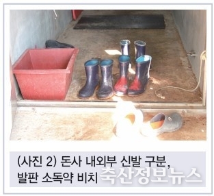 농장 내부에서도 돈사 외부 오염지역에서 돈사 내의 돼지에게 병원균이 도달하는 것을 최소화해야 한다. 반드시 전실을 운영하고, 돈사 내부와 외부의 작업화를 갈아 신는 것을 기본으로 한다. 또한 돈사 내부 복도나 통로를 수시로 수세하여 혹시라도 유입될 수 있는 병원균을 제거해야 한다. 질병이 안정되고 생산성이 높은 농장의 경우 복도, 통로 수세를 철저히 하는 경우가 많다.