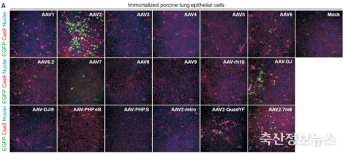 국립축산과학원 연구진은 돼지 폐 세포에 가장 적합한 유형을 알아보기 위해 2023년 국내 최초로 자체 개발한 유전자 가위(Cas9)가 발현되는 돼지에서 폐세포를 분리한 뒤 ‘불멸화 돼지 폐세포주’를 새롭게 구축했다. 이 세포주는 돼지 폐 세포 특성을 유지하면서 반복 실험이 가능해 장기간 안정적으로 유전자 전달 효율을 비교·평가하는 데 적합하다. 이를 활용해 아데노 관련 바이러스(AAV) 18종을 대상으로 돼지 폐 세포 내 전달 효율을 비교‧분석한 결과, AAV2 유형이 약 52%로 가장 높았다.