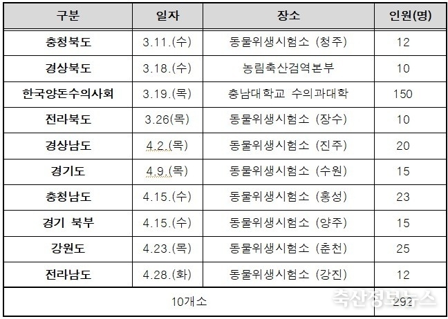 이번에 처음으로 편성된 돼지수의사 교육은 3월 19일 충남대학교 수의과대학에서 150여 명을 대상으로 진행될 예정이다. 지방정부 수의공무원 교육은 권역별로 나뉘어 3월 11일 충북 동물위생시험소(청주)를 시작으로, 4월 28일 전남 동물위생시험소(강진)까지 전국 9개소에서 순차적으로 진행된다.