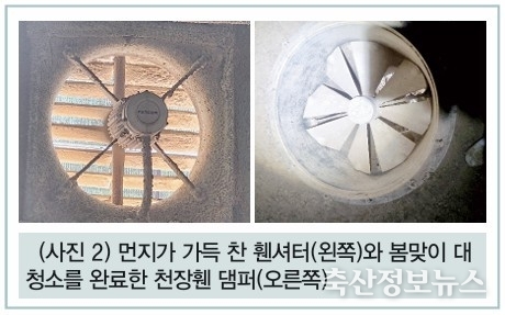 겨울 동안 저속 환기가 이루어지면서 휀셔터와 댐퍼에 붙어버린 먼지도 봄철 원활한 환기를 위해서는 청소가 필요하다. 시간이 걸리더라도 꼼꼼하게 먼지를 제거해야 온도가 서서히 올라가는 봄철 안정적인 환기를 유지할 수 있다.