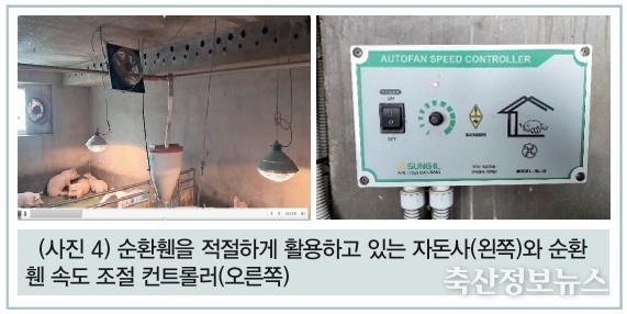 겨울 동안 많은 농장이 급격한 휀 가동으로 인해 자돈들이 유속을 느끼지 않도록 온도 편차를 5~6℃로 설정하고 사용해 왔을 것이다. 하지만 봄이 되면서 낮에는 온도가 조금씩 오르기 때문에 낮에는 배기량을 약간 올려줄 필요가 있다. 봄철 낮 시간대에는 온도 편차를 4℃ 정도로 줌으로써 외부 온도가 올라감에 따라 조금 더 휀을 통해 배기가 이루어질 수 있도록 조치하고, 필요할 경우 최대배기량을 겨울철보다는 조금 더 높여주는 것이 바람직하다.