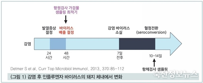 이 바이러스는 돼지 체내에서 항원 배출이 매우 빠르게 진행된다. 이 말은 바이러스를 검출할 수 있는 시기가 매우 짧아서 실제 인플루엔자 감염이 있었음에도 가검물 검사에서 음성이 나올 확률이 매우 높다. 이런 이유로 인해 현장에서는 인플루엔자 진단을 하지 못해 적절한 조치가 이루어지기 어렵게 된다. 이러한 검출의 어려움을 극복하고자 비강스왑/구강액 채취/폐의 병리 조직 검사를 적절히 조합하여 검사해야 하며, 채혈 검사는 바이러스 검출에 큰 도움이 되지 않는다.