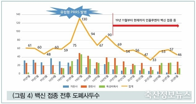 (그림 3)의 결과가 나온 농장의 경우 처음은 항생제+해열제 음수 투약의 대증요법을 하였으나, 큰 호전이 보이지 않아 자돈 백신을 적용한 경우이다. 백신은 자돈에 4주령, 7주령 2회 접종하였다. 백신 전후 도폐사율은 (그림 4)와 같다.