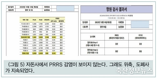 (그림 2)의 결과서는 서로 다른 농장으로 비슷한 시기에 인플루엔자 바이러스가 검출된 사례이다. 두 농장 모두 자돈에서 복식호흡, 기침 증가, 콧물 등 호흡기 증상이 발생하여 농장에서는 PRRS를 의심하였으나 모두 인플루엔자로 확진되었다.