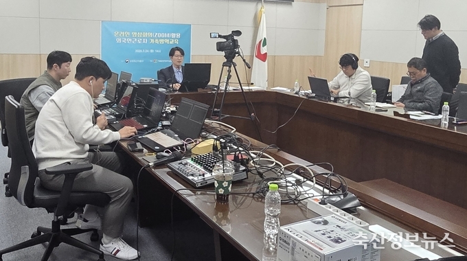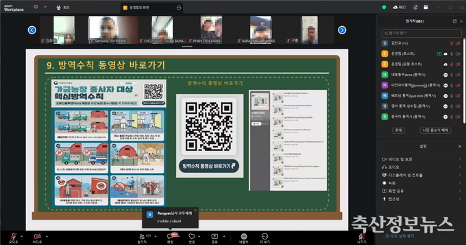 가축위생방역지원본부(김태환 본부장)는 지난 3월 24일 농림축산식품부와 함께 위생방역본부 2층 회의실에서 ‘가금농장 외국인 근로자 대상 온라인(ZOOM 활용) 영상교육’을 추진했다고 밝혔다.
