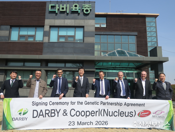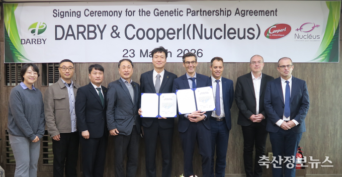 다비육종(대표이사 윤성규)은 프랑스 Cooperl 그룹의 육종 전문기업 Nucleus(뉴클리어스)와 유전자 기술협력 계약을 성공적으로 갱신하고, 향후 7년간 전략적 협력을 지속하기로 했다고 밝혔다. 이번 협약은 Nucleus의 모기업인 Cooperl 이사회 관계자들의 방한 기간 중 한국에서 공식 체결되었으며, 다비육종이 글로벌 수준의 유전자원을 안정적으로 확보하고 이를 국내 양돈현장에 지속해서 접목해 나가기 위한 중장기 기반을 다시 한번 공고히 했다는 점에서 의미가 크다.