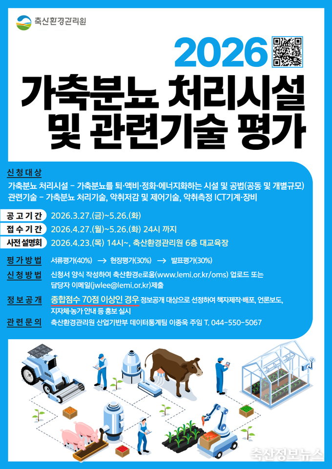 축산환경관리원(원장 문홍길)은 지난 3월 27일부터 5월 26일까지 ‘2026년 가축분뇨 처리시설 및 관련기술 평가 계획’을 공고하고, 신청접수는 4월 27일부터 진행한다고 밝혔다.