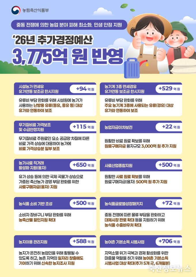 농림축산식품부(장관 송미령)는 국회에서 2026년 추가경정예산안을 논의하는 단계에서 4개 사업 총 1,118억원을 증액했다고 밝혔다.